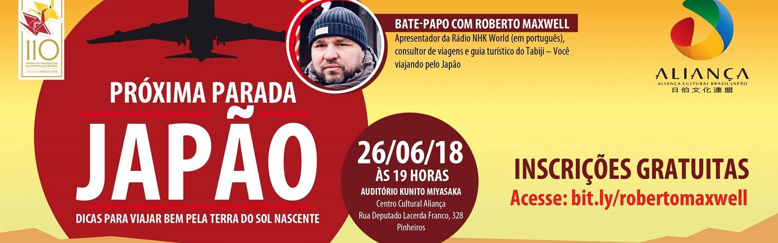 Em mais uma iniciativa para motivar os alunos a se dedicarem ao estudo da língua japonesa, a Aliança Cultura Brasil-Japão promove no dia 26 de junho (terça-feira) , no Auditório Kunito Miyasaka, do Centro Cultural Aliança, um encontro com o jornalista brasileiro Roberto Maxwell, radicado no Japão desde 2005, que atualmente é repórter freelancer, apresentador da Radio Japão (NHK World Japan) e um dos acompanhantes de viagem do Tabiji – Você viajando pelo Japão, que organiza tours privadas em Tokyo e no Japão.