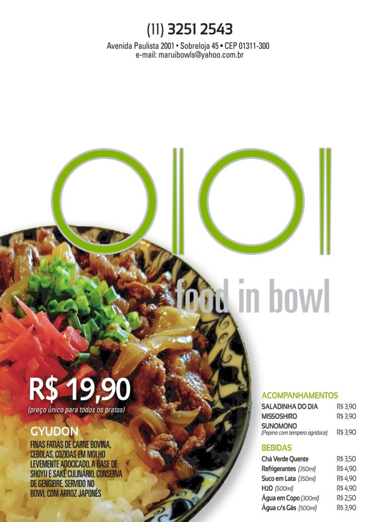 Acaba de inaugurar na avenida Paulista, o OIOI food in bowl (a logo, que guarda semelhança com o OIOI das lojas de departamento Marui, é sugestivo: o O é a tigela vista por cima, e o I é um hashi). Fica dentro de uma galeria, ao lado do Conjunto Nacional, e pertence ao empresário Lúcio Kamimura, que tem mais duas casas de comida rápida (um especializado em carnes e o outro um ótimo por kilo), além de uma loja de vinhos (sim, Lúcio é um expert da bebida), tudo na mesma galeria. Sua esposa, Taïs Isensee, no comando do caixa e atendimento garantem todo o cuidado na prestação do serviço.