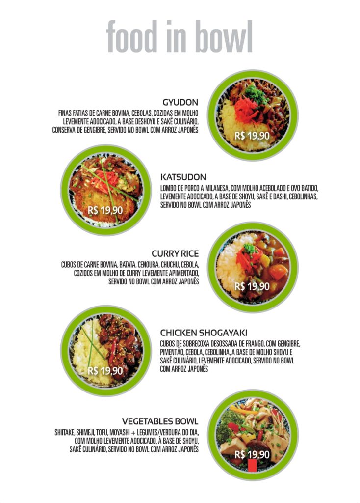 - Vegetables Bowl: um mix de cogumelos shiitake e shimeji, legumes e verduras do dia com o mesmo molho do gyudon, levemente adocicado, sobre arroz.