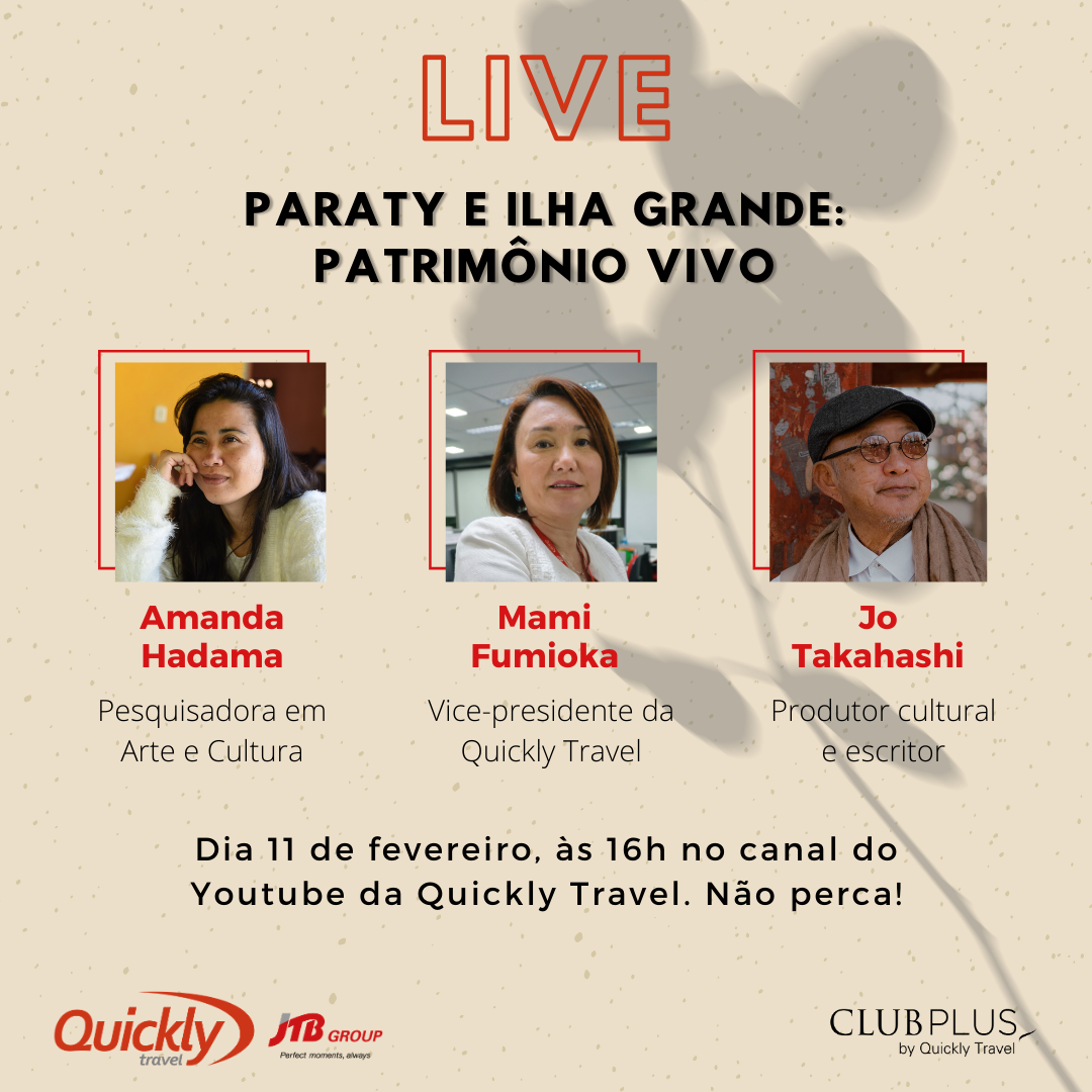 Assista aqui à live que fizemos com a produtora e pesquisadora Amanda Hadama, que nos contou mais detalhes sobre Ilha Grande, Paraty e este financiamento coletivo. Como sempre, a nossa anfitriã, Mami Fumioka, vice-presidente da Quickly Travel, nos acolheu com todo o conforto, para uma tarde deliciosa.