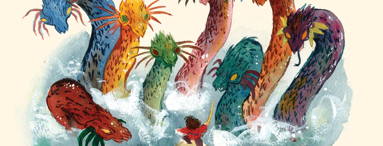 Eis que surge Yamata-no-Orochi, fazendo a terra tremer com seus passos. Mas o monstro é seduzido pela curiosidade, enfia o longo pescoço pelos portais e alcança os barris. E num gole, cada cabeça mergulha em um barril. Logo vem o efeito do saquê potencializado e a fera se derrete em sono profundo.