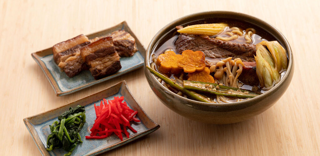 Ramen Ikigai: inspirado no sukiyaki e em Okinawa, o prato foi criado pelo ramen master Takeshi Koitani e pelos chefs Thyago Anasawa e Jana Costa, do Jojo Ramen. Tem caldo composto de porco, frango e dashi: é delicado e, ao mesmo tempo, potente. O macarrão é temomi (ondulado) e mais leve, no estilo Kitakata. O destaque é o Rafute, barriga de porco cozida, típica de Okinawa, cozinhado por longas horas em um caldo com Awamori (bebida regional). Para completar, o ramen vem com costela suína, minimilho, quiabo grelhado, cogumelo enoki, cebolinha naganegui e abóbora defumada. De acompanhamento, há espinafre horenso e gengibre agridoce (gari shoga).